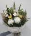 A stunning pacific bouquet is created with white and green flowers/foliage in a natural flax mat.